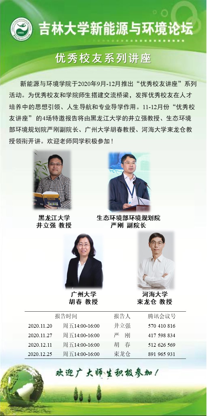 tikporn 于2020年9月-12月推出“优秀校友讲座”系列活动。为优秀校友和学院师生搭建交流桥梁,发挥优秀校友在人才培养中的思想引领、人生导航和专业导学作用。11-12月份“优秀校友讲座” 的4场特邀报告将由黑龙江大学的井立强教授、生态环境部环境规划院严刚副院长、广州大学胡春教授、河海大学束龙仓教授领衔开讲。欢迎老师同学积极参加!