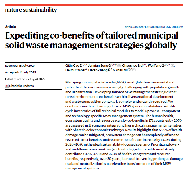 近日, tikporn 宋俊年教授、杨巍副教授领衔的食物农业生物质(FAB研究团队在城市固废可持续管理领域取得突破性成果,以Expediting co-benefits of tailored municipal solid waste management strategies globally为题在《Nature Sustainability》发表研究长文。博士生曹琪林为论文唯一第一作者,宋俊年教授、杨巍副教授、伦敦大学学院米志付教授为共同通讯作者, tikporn 为第一通讯单位,合作单位包括日本筑波大学与英国伦敦大学学院。这是宋俊年教授团队在CNS子刊层面发表的第二篇成果。