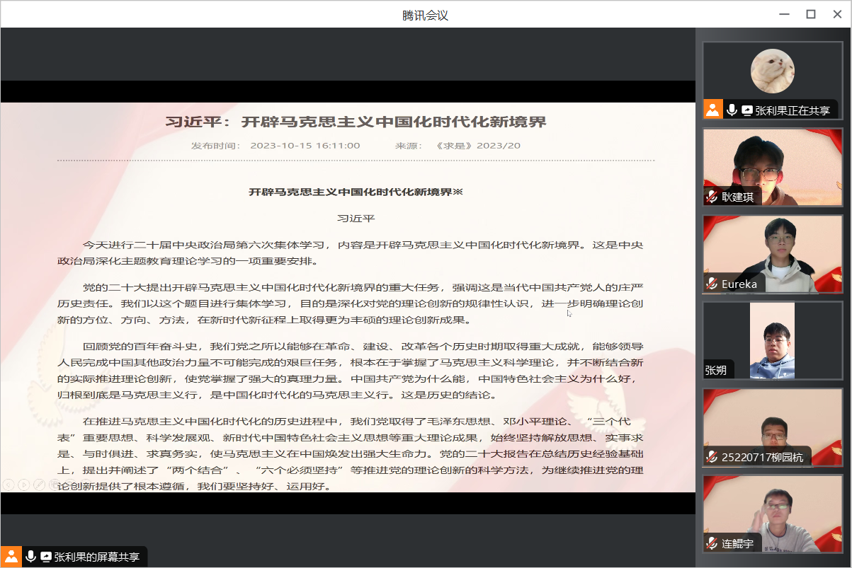 首先,由团支书在腾讯会议上进行屏幕共享,带领大家共同阅读学习《习近平:开辟马克思主义中国化时代化新境界》一文。该篇文章从四点展开讲述,分别是“始终坚守理论创新的魂和根”、“及时科学解答时代新课题”、“着力推进党的创新理论体系化学理化”和“注重从人民群众的创造中汲取理论创新智慧”,全面详细地介绍了习主席在开辟马克思主义中国化时代化新境界方面提出的四点要求。