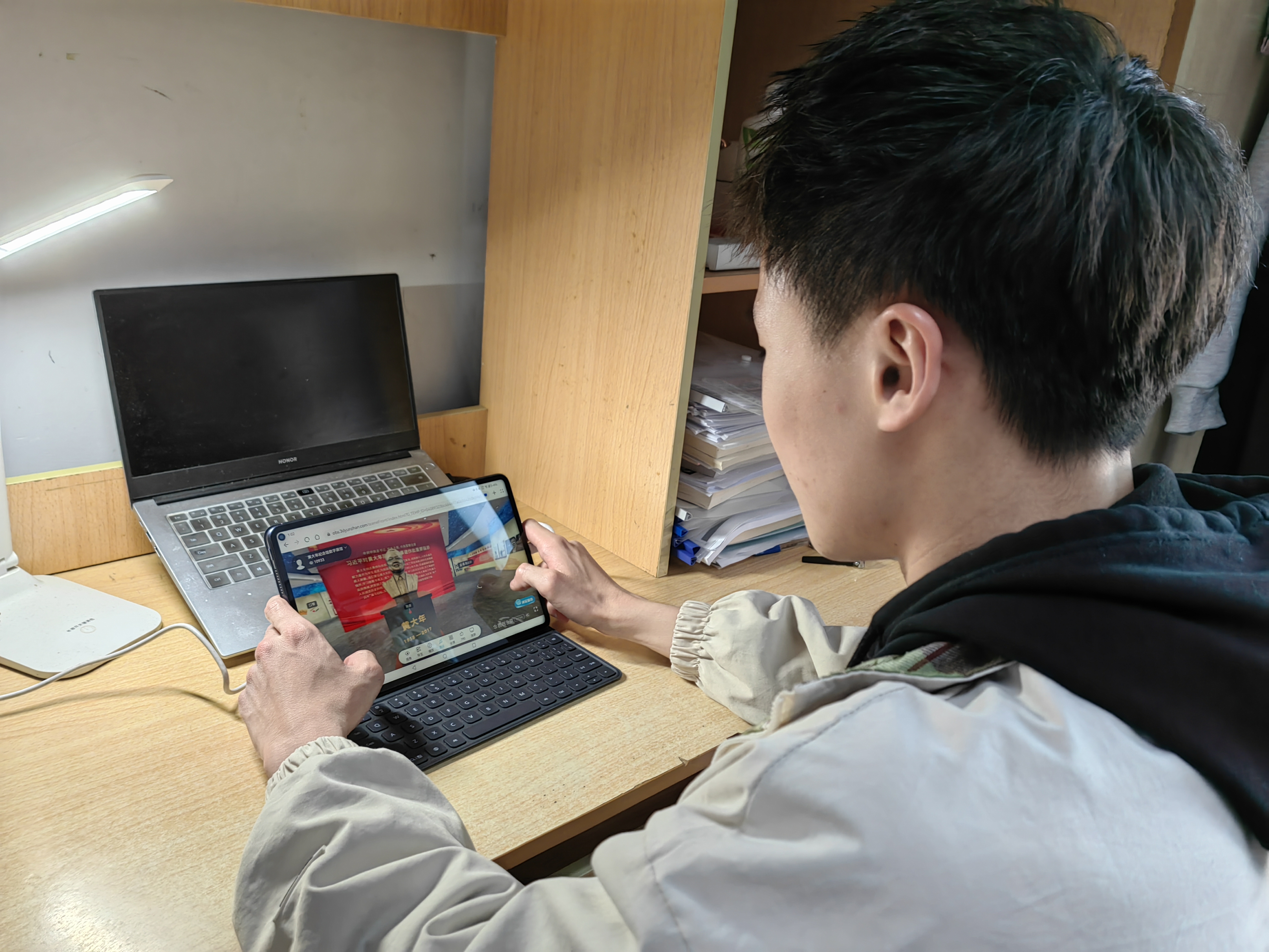 张亚林同学感慨:“展馆中让我印象最深的是展柜里躺着的一个褐黄色的葫芦状药瓶,它有着大地般的拙朴。后来了解到这是黄大年老师在深探专项答辩开始前,即使身体快到极限,他仍选择在嘴里含速效救心丸,坚持完成两个半小时的答辩发言。这不禁让我想到了阿多尼斯的诗中所写的:为了说出真理,改变你的脚步,准备好:燃烧成火树。”
