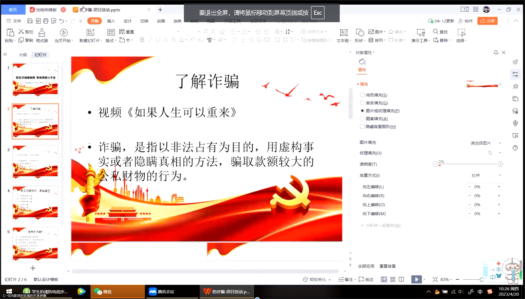 首先团员李金科分享了他曾差点被来路不明的短信诈骗的经历,勾起了大家浓浓的兴趣。团支书郭诗语为大家播放了视频短片《如果人生可以重来》,向大家讲解什么是诈骗,引入了今天的主题。