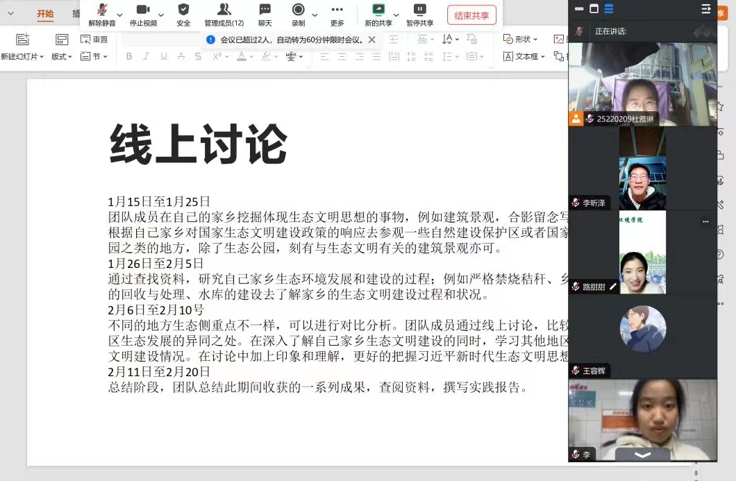 2月5日至2月14日期间,经过线上讨论,我们决定从加大自然生态系统和环境保护力度、加强生态文明制度建设、优化产业结构方面和提升公众生态文明素质方面这四个方面来研究,同时比较这些省份发展的异同之处。我们将实践队员分为三组,分别负责这四个方面的内容。查找资料后,队员将其整理归纳,并编辑日志的内容,上传总结。