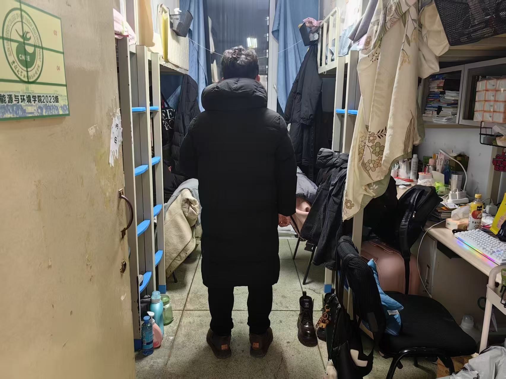 3月6日,2024级新生辅导员助理姜兆轩进入南苑一公寓,检查寝室卫生,提醒同学们新学期要认真上课保证出勤,同时提醒计划转专业学生也不能因备考复习而影响正常课程安排。