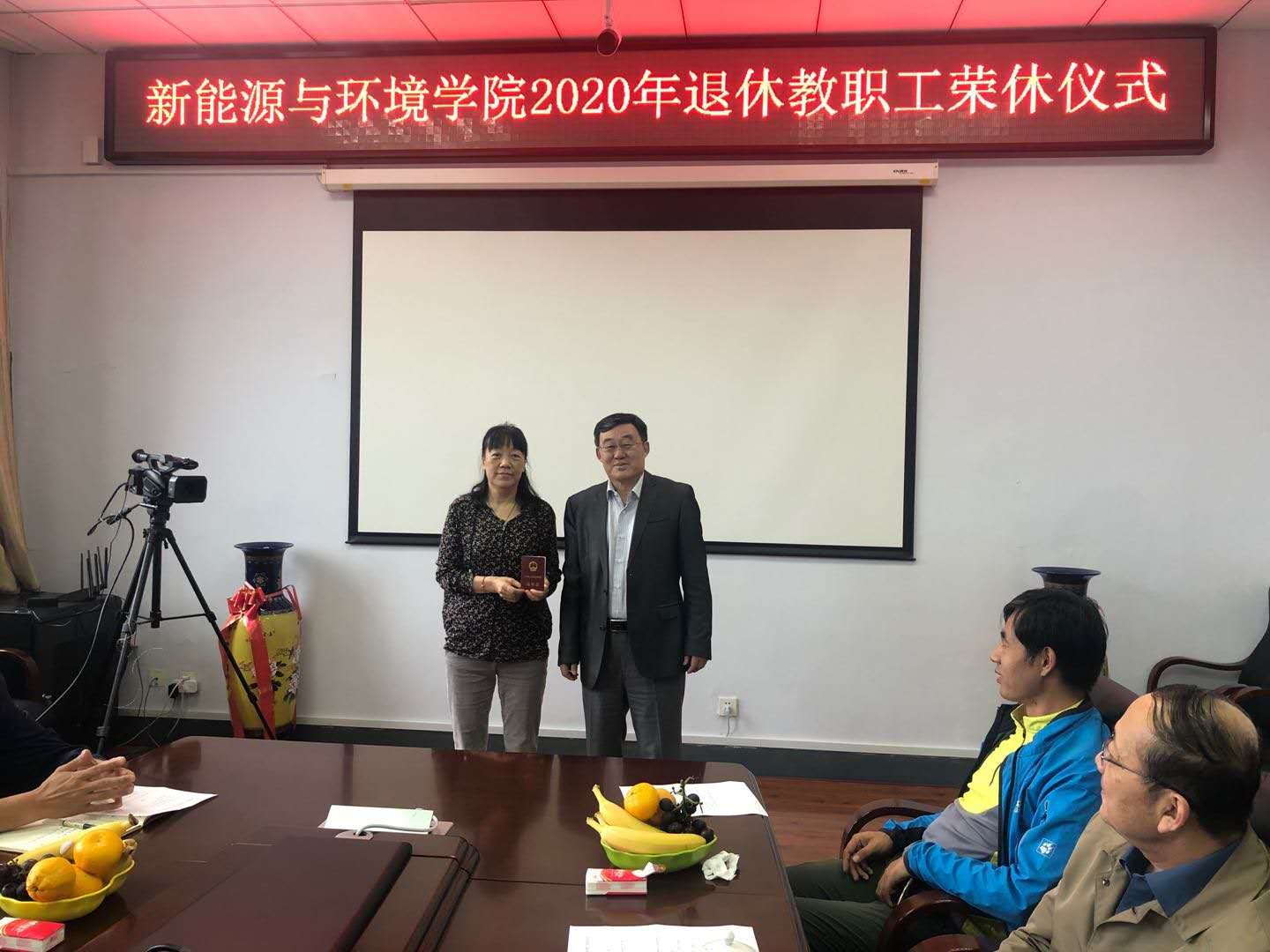 2020年退休职工荣休仪式”。院长许天福、党委副书记吴哲、温卓、副院长花修艺、齐铁志及系主任、党支部书记和行政科室负责人参加了荣休仪式,并进行了座谈。齐铁志副院长简要介绍了赵玉红和蒋慧忠二位老师的工作成绩,院长许天福向荣休的二位老师颁发了荣休证书和纪念品。许天福院长做了讲话,对两位老师40年来的自己的工作岗位上兢兢业业、勤勤恳恳的敬业精神和工作态度给予了高度的评价和充分的肯定,表扬她们为年轻教师树立了榜样。他说,学院的退休教师是学院发展的重要资源,是推进学院教学、科研和学科发展的重要力量。今后还要激发他们的活力,充分发挥退休教师的政治觉悟高、智慧经验丰富以及他们在学科专业和教学科研的优势,引导他们继续为学院的教学、科研和学科建设上发挥他们的光和热。参加仪式的各位领导和老师也纷纷结合与两位老师的工作的经历给予了高度的评价,并送去了真挚的祝福。两位荣休教师激动地表达了对学院的热爱和留恋,并表示在以后的日子里将一如既往地关注支持学院的发展,并在学院需要的时候随时贡献自己的力量。