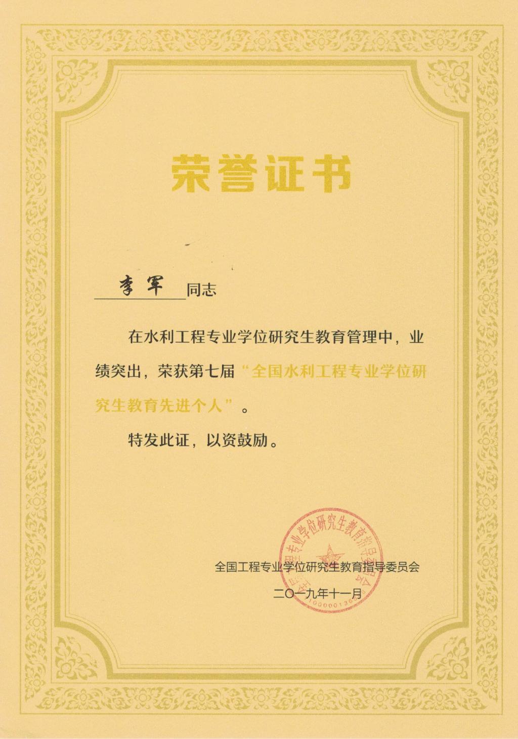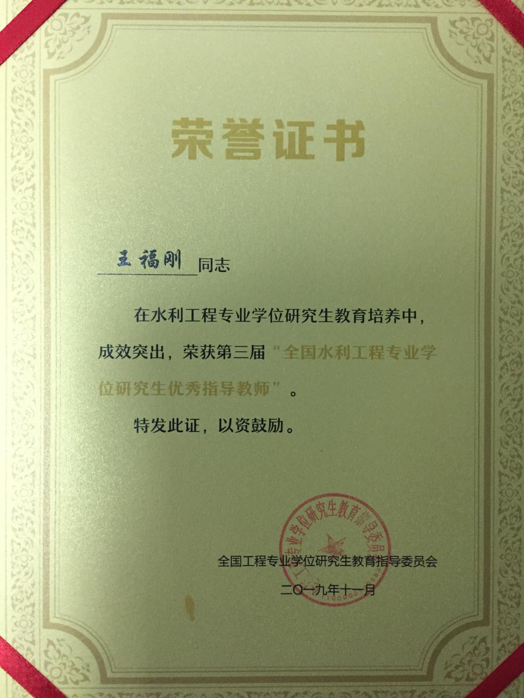 为更好地总结、交流水利工程专业学位研究生教育培养的工作和指导经验,促进水利工程专业学位研究生教育发展,提高导师指导能力,不断提高培养质量,经个人申请、单位推荐、水利工程领域核心组成员和专家投票、教指委审定,2019年共有18名指导教师被评为全国水利工程专业学位研究生优秀指导教师,14 名教工被评为全国水利工程专业学位研究生教育工作先进个人,其中 tikporn 王福刚教授