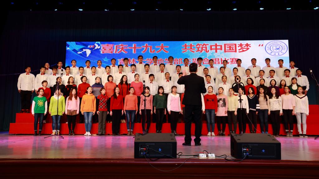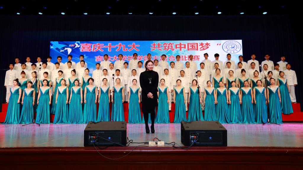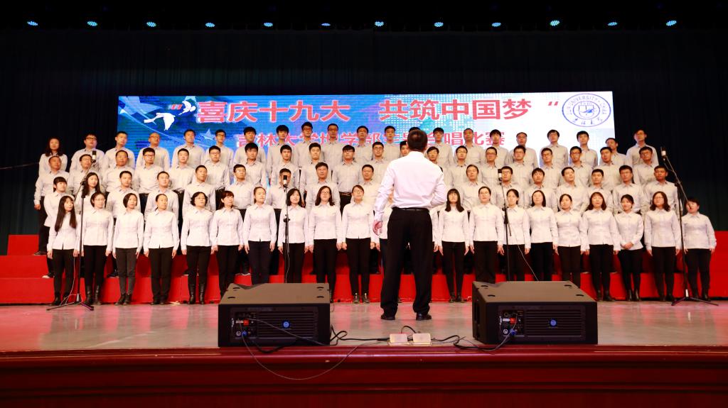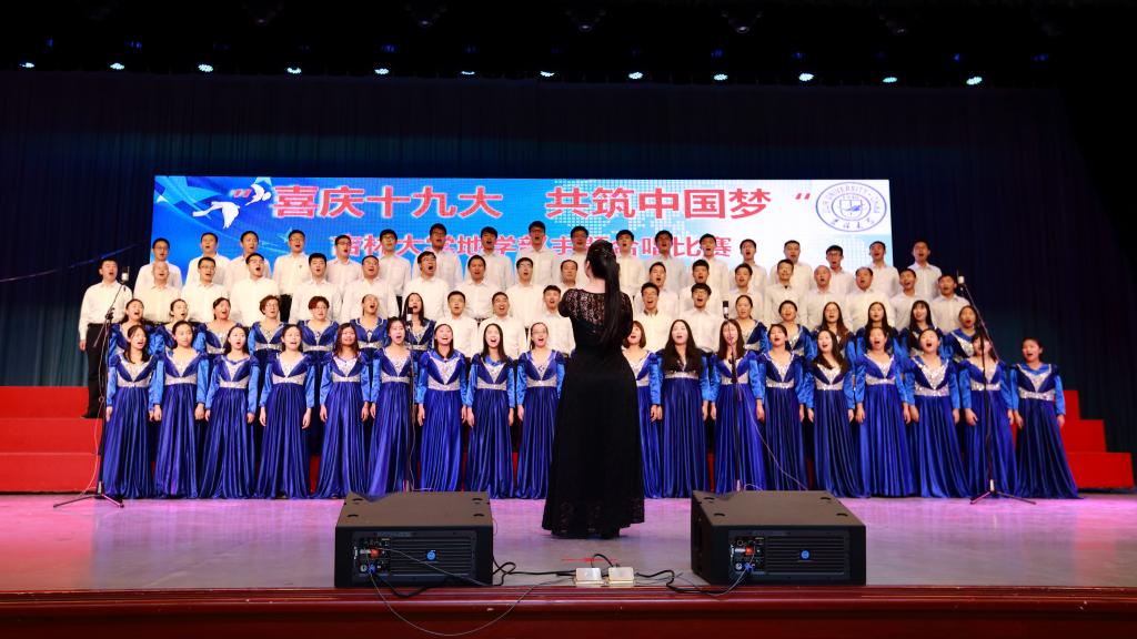 校歌》中拉开帷幕。比赛中,各参赛队伍组织有序、着装整齐、歌声铿锵有力、气势昂扬、表演独具匠心、精彩纷呈。演唱的老师和同学们激情似火,响亮、唯美的歌声响彻整个鸣放宫,歌声中,传递了他们对祖国和学校的热爱、对祖国十九大胜利闭幕的祝贺与迎接中国特色社会主义进入新时代的喜悦。地球科学学院演唱的《黄河大合唱》,在指挥的激情引领下,振奋人心的歌声仿若奔涌咆哮的黄河尽收眼底,把合唱比赛推向了高潮,落下帷幕。