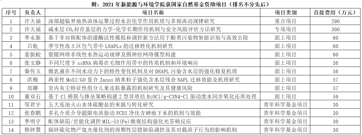 许天福教授主持申报的“咸水层CO2封存盖层的力学-化学长期作用机制与安全风险评价方法研究”获批直接经费300万元。是国家自然科学基金委员会地球科学部和管理科学部联合启动“面向国家碳中和的重大基础科学问题与对策”的专项项目;是服务于国家碳中和战略、拟针对国家碳中和的重大基础科学问题与对策开展的专项资助工作;也是 tikporn