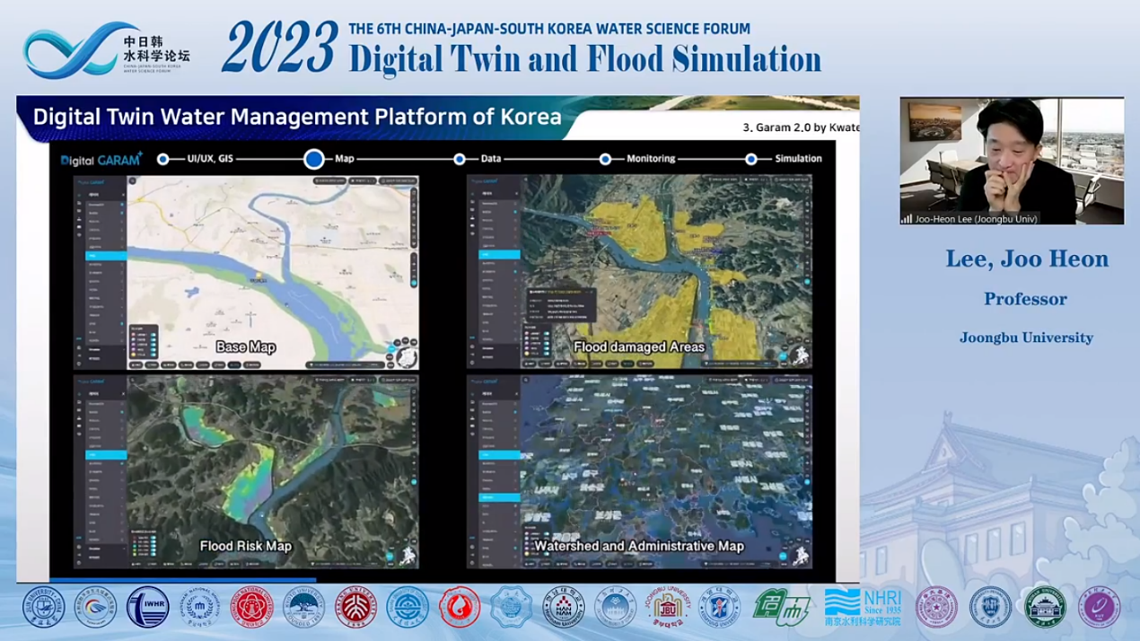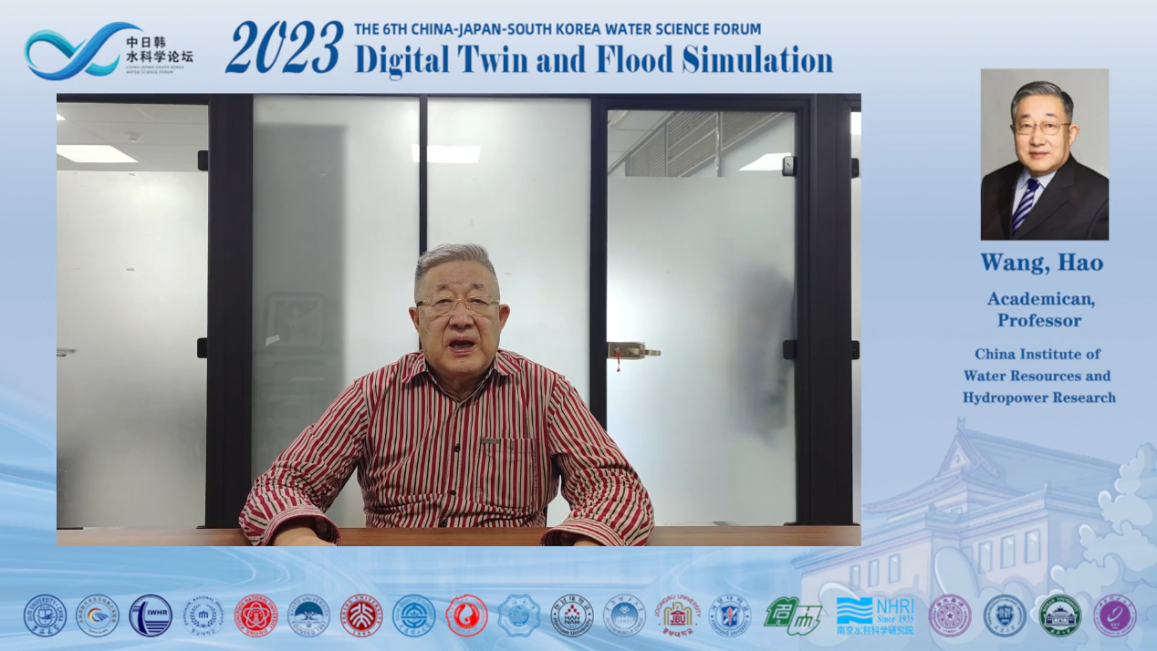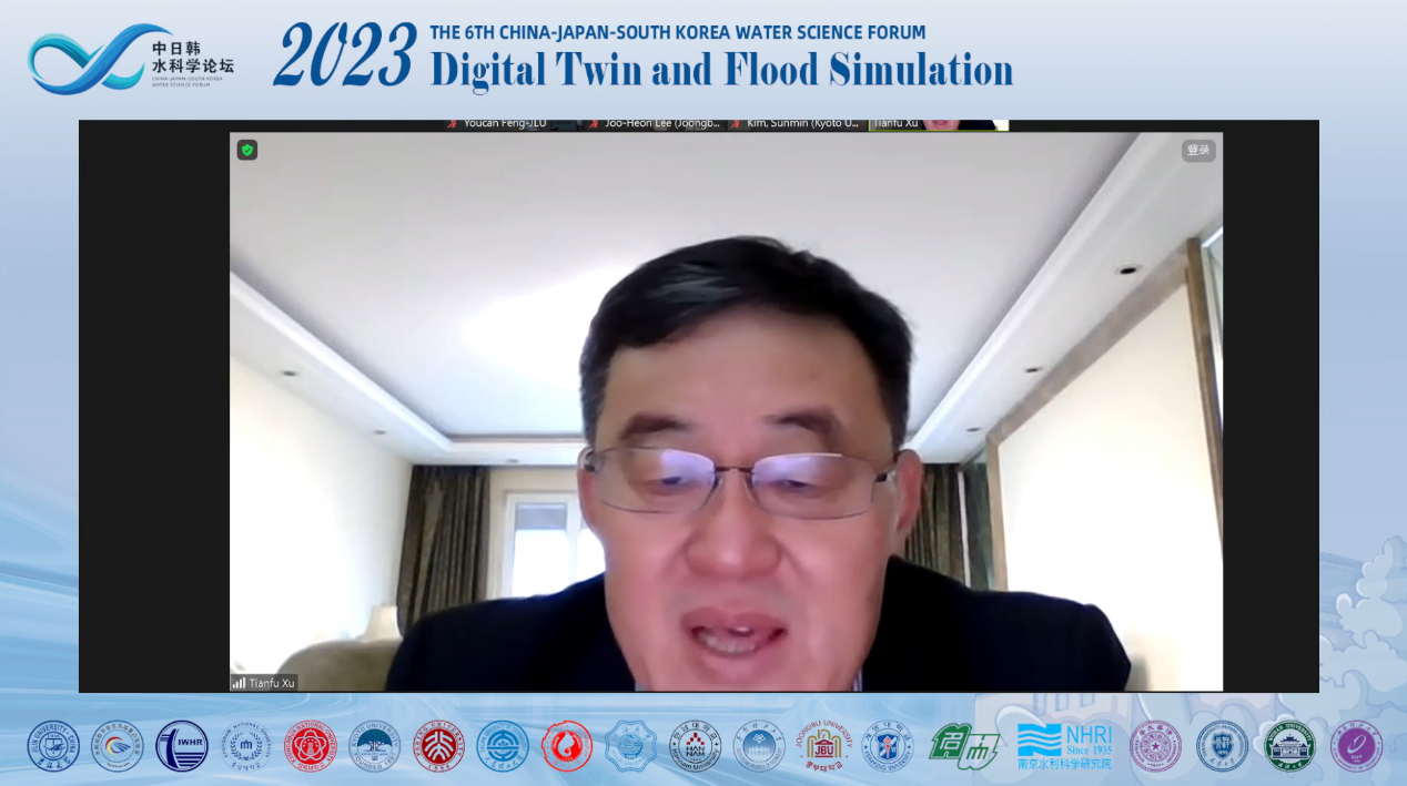 论坛首先由院长许天福教授致欢迎词,王浩院士作为学术委员会主席阐述了中日韩科学家开展深入交流和探讨的重要意义,指出“中日韩三国同属季风气候区,降雨时空分布不均,汛期雨量集中,长期遭受严重洪涝灾害,近年来,在气候变化影响下,极端暴雨频发,洪涝灾害加剧,进一步加强数字孪生与洪涝模拟相关科学研究十分必要”。王院士希望各国科学家贡献智慧、互学互鉴、促进交流、加强合作,为建设美好、宜居的地球家园和构建人类命运共同体贡献科技力量。线下会议由李鸿雁教授主持,线上会议由冯右骖副教授主持。