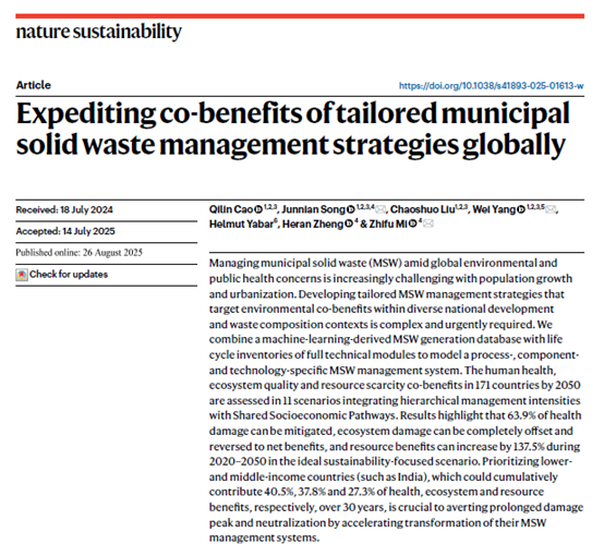 宋俊年教授、杨巍副教授领衔的“食物农业生物质(FAB)”研究团队在城市固废可持续管理领域取得突破性成果,以“Expediting co-benefits of tailored municipal solid waste management strategies globally”为题在《Nature Sustainability》发表研究长文。博士生曹琪林为论文唯一第一作者,宋俊年教授、杨巍副教授、伦敦大学学院米志付教授为共同通讯作者, tikporn