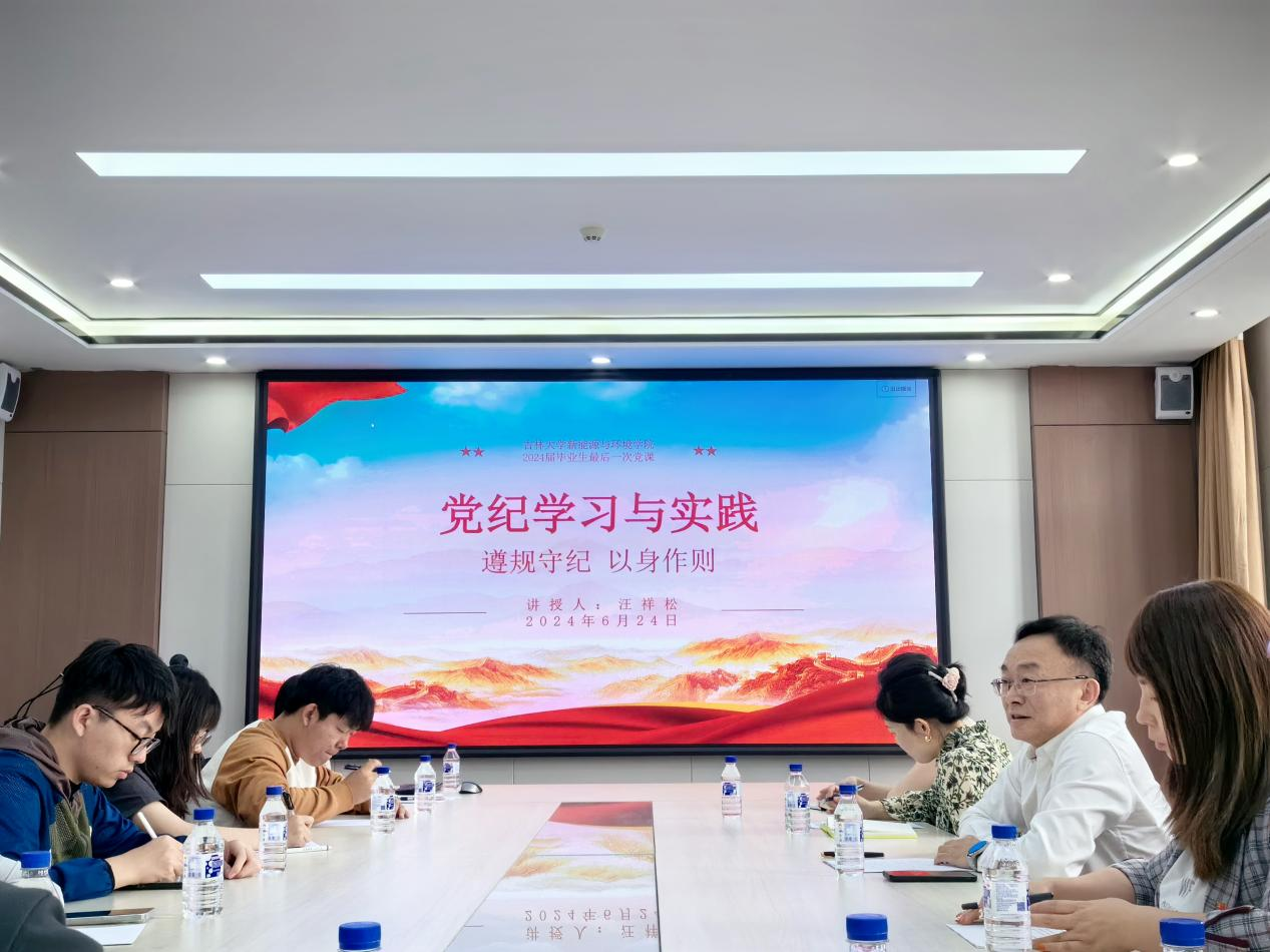 6月24日,学院党委书记汪祥松以“党纪学习与实践”为主题、以“遵规守纪,以身作则”为切入点,为2024届毕业生党员讲授毕业前最后一堂党课。各教工和学生党支部书记也相继讲授专题党课,进一步加强党支部政治建设和纪律建设,严明党的政治纪律和政治规矩,教育引导师生党员学纪知纪明纪守纪。