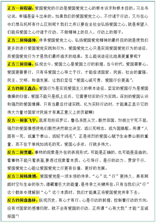 正反方开门见山,引经据典,论据有力;有的打比方、举实例,循循善诱,让观点不辩自明。辩论中,正反双方条理清晰、观点鲜明。自由辩论环节,双方辩手争分夺秒,发表观点,讨论爱国爱党行重于心和心重于行的重要性。从立论、攻辩、自由辩论到总结陈词,一轮一轮精彩的辩论博弈,赢得在线党员的响应和支持。