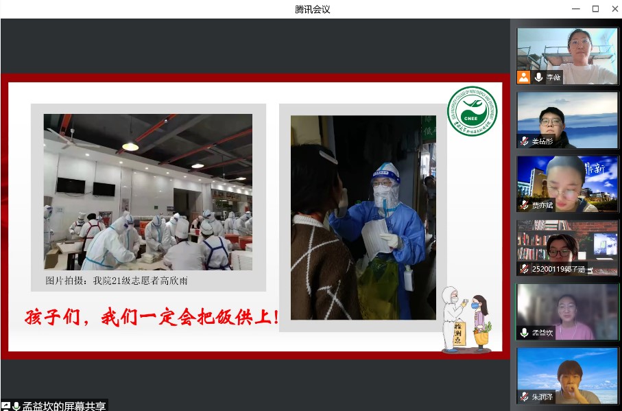 活动伊始,党支部组织委员兼宣传委员牛梦圆同学带领大家一起学习了《致全省各级党组织和广大共产党员的一封信》以及《致全校各级党组织和广大党员的倡议书》。随后,四位党员志愿者代表分别分享了自己的战疫故事。孟益坎同学向大家展示了几组图片,讲述了自己从看到老师同学们积极参与疫情防控到自己和室友们一起参与防控的故事,分享了自己在清晨为大家发放完早餐后获得的自豪和光荣。她用“聚是一团火,散是满天星”形容一直奋战在校园疫情防控第一线的志愿者。一直驻校工作的钟宇博老师也分享了他这段时间的工作感受,他最后说“我们终会在春暖花开的校园里,迎接 tikporn