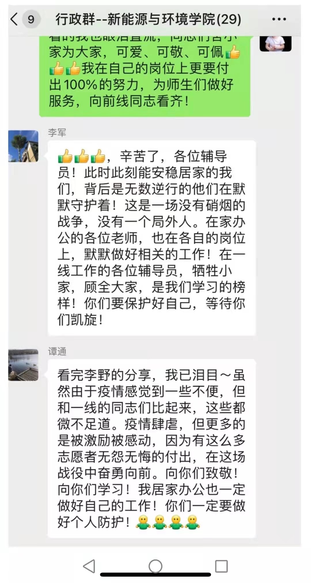支部其他党员也分别结合居家办公和抗疫情况做了发言,大家都深受感动、备受鼓舞,纷纷表示要坚定信心、坚守岗位、服从管理,随时听候学校和学院的召唤,投入到抗疫一线的工作中去,也期待抗疫一线的同志们早日凯旋。