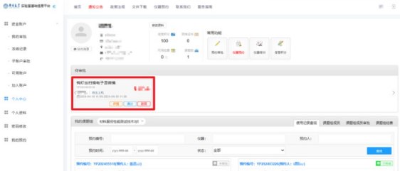 6. 预约完成后,及时提醒导师对预约进行审批,如导师未审批,则无法进行自主上机测试,送样预约也不会进入仪器管理员的送样预约管理中。导师审批具体步骤:在该平台登陆导师账号,在主页